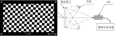 如果HFOV≥140°,使用斜棋盤格測試圖卡進行測試,調(diào)節(jié)DUT與測試圖卡之間的距離,使測試圖卡中方格邊緣的長度不得少于10像素;