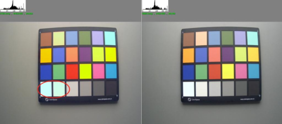 如下圖,左邊的圖整體白平衡誤差明顯,且眾多色塊明顯偏色,這種色彩響應(yīng)對于消費電子行業(yè)的影像效果來說是不能接受的。