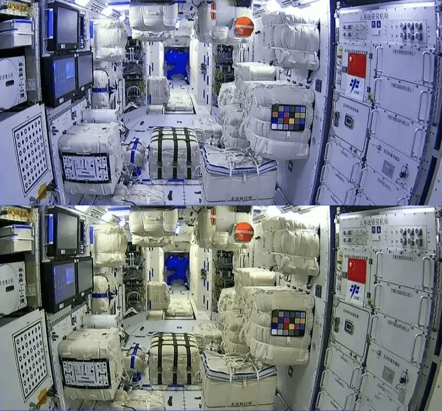 在央視的直播畫面中,我們可以看到一張標(biāo)準(zhǔn)的24色標(biāo)準(zhǔn)色卡,如下圖紅色圓圈中所示。這張色卡是用來實時矯正核心艙中攝像設(shè)備的色彩的。太空中的射線是時刻變化又不可控的,因此拍攝的照片顏色通常也是失真的,這就需要標(biāo)準(zhǔn)的色卡來幫助我們將拍攝的畫面矯正到真實的顏色。