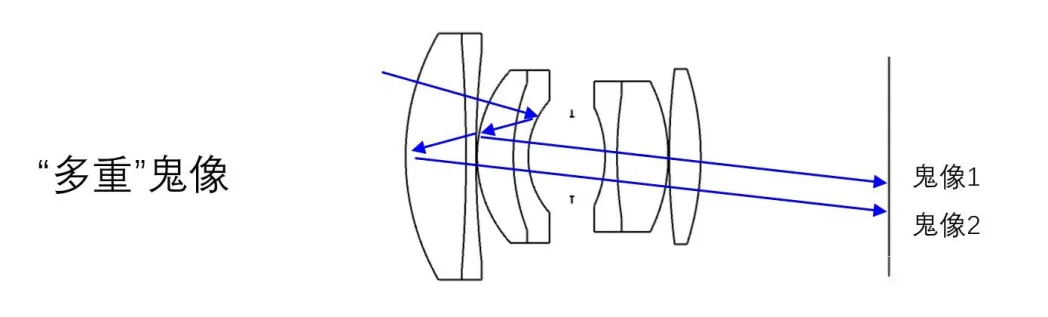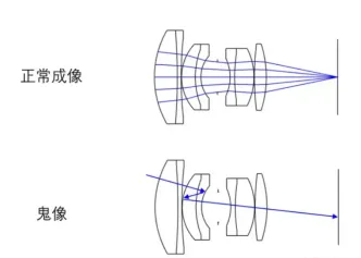 環(huán)境中存在的高亮度目標(biāo)源在鏡頭內(nèi)部各個透鏡間快速反射,最終在圖像上形成的附加像,其亮度一般較暗,且與原像錯開。由于任何兩個鏡片表面都可能發(fā)生這種現(xiàn)象(應(yīng)該說都在發(fā)生,只是強度不同),兩兩組合可以產(chǎn)生很多光路,因此在這種情況下常常會形成一“串”光斑。