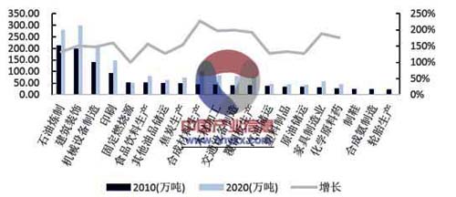 2010年及預(yù)測2020年VOCs排放量大于20萬噸的主要行業(yè)