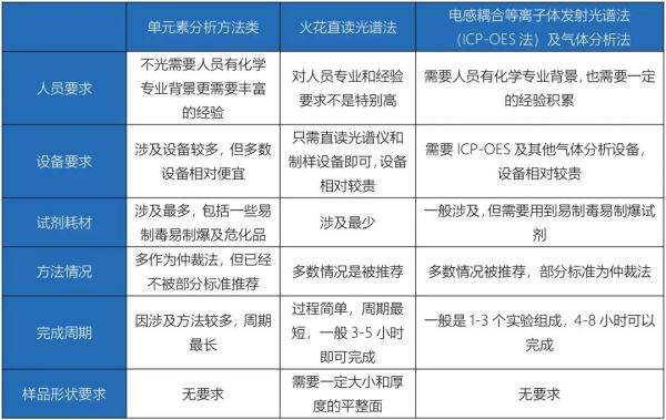 金屬成分分析的本質(zhì)是元素含量的分析,關(guān)于元素含量的分析手段有很多,例如:化學(xué)分析法、原子/ICP光譜法、X射線能量色散譜法(EDX)、電子能譜分析法、X射線衍射法(XRD)、質(zhì)譜法(MS)、分光光度計(jì)法、火花直讀光譜法、氣體分析法等。本文主要介紹成品金屬材料的推薦分析方法。